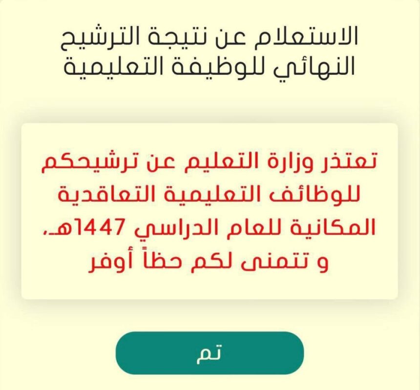 وأشاروا إلى أنهم تكبدوا عناء السفر من مناطق مختلفة لحضور المقابلات في إدارات التعليم، معتقدين أن الترشيح أصبح مؤكداً بعد المقابلات، إلا أن الصدمة جاءت لاحقاً بالاستبعاد النهائي دون أسباب واضحة. وأضاف المرشحون، أن بعض إدارات التعليم ردت على استفساراتهم بأن عدد المرشحين يطابق عدد الوظائف المعلنة، ما زاد من استغرابهم من الاستبعاد المفاجئ. وطالبوا الوزارة بإيضاح آلية الفرز، وكيف تم استبعادهم رغم اعتبارهم «مرشحين نهائيين» بموجب المادة (28)، التي تنص على أن المفاضلة تتم بين المتقدمين بناءً على الأعلى نقاطاً، وأن الإعلان النهائي للتعيين يتم بعد انتهاء إجراءات المقابلة والمطابقة.