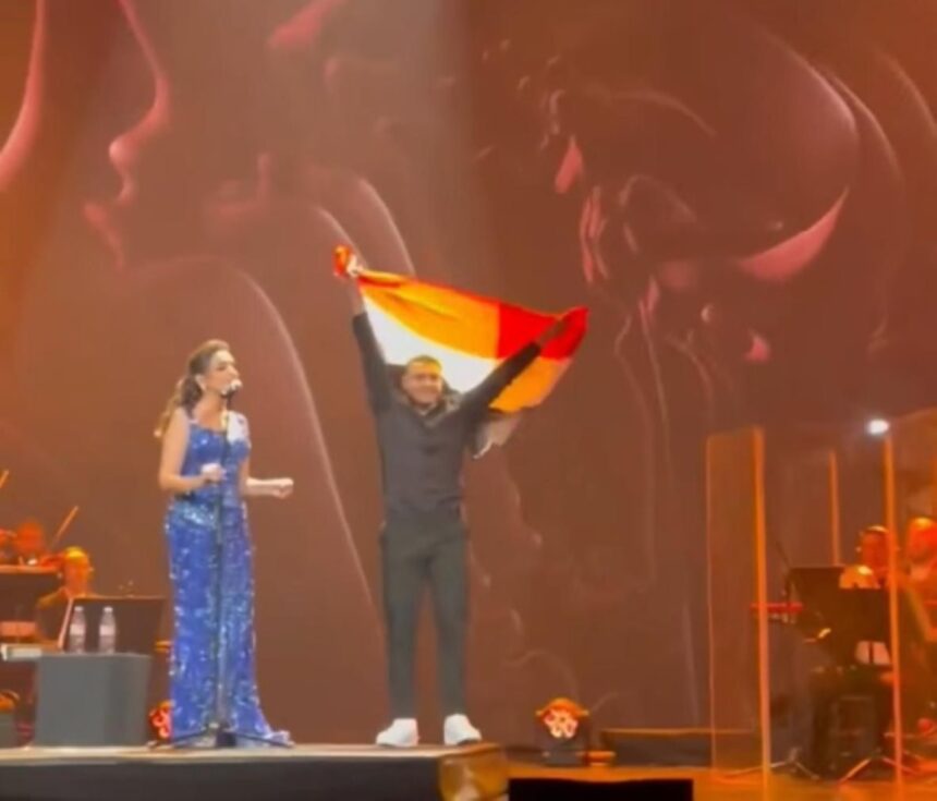 انتشر مقطع فيديو على منصات التواصل الاجتماعي من حفل أنغام يظهر أحد المعجبين وهو يصعد إلى المسرح ويهديها العلم المصري أثناء غنائها، حيث احتفلت الفنانة معه ورفعته واحتضنت العلم وسط تفاعل حماسي من الجمهور.