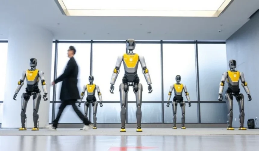 عرض مركز ابتكار الروبوتات البشرية في منطقة «تطوير التكنولوجيا الفائقة» في الصين العديد من الروبوتات المتطورة، التي تم تصنيعها بشكل مقارب لحجم الإنسان، وتؤدي العديد من المهمات المتطورة. وتظهر الصورة مجموعة من الروبوتات المعروضة المهيأة للبيع للشركات المتخصصة. (إيكونومي دايلي الصينية)