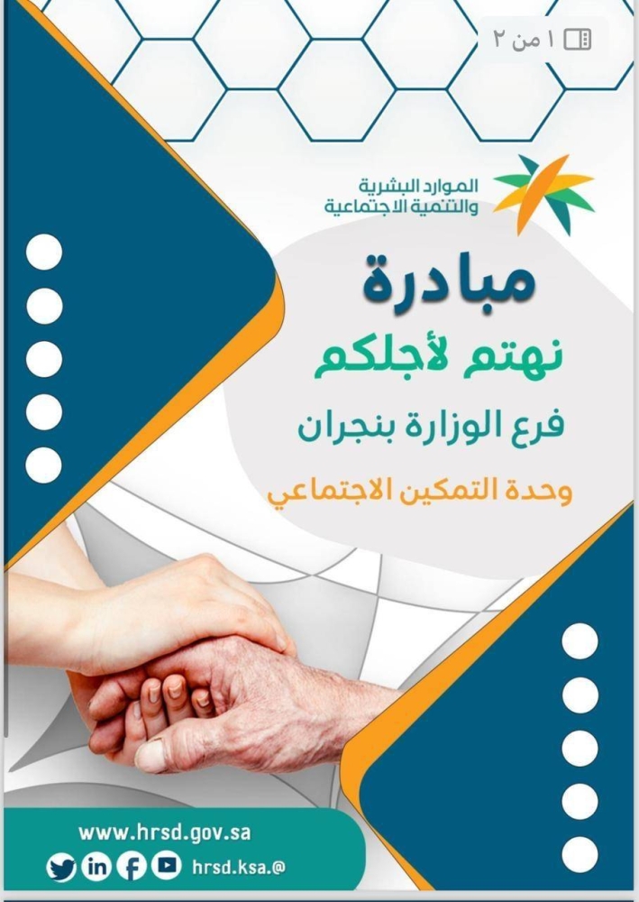 يطلق فرع وزارة الموارد البشرية والتنمية الاجتماعية بمنطقة #نجران مبادرة (نهتم لأجلكم) لتقديم خصومات خاصة لمستفيدي #الضمان_الاجتماعي وتابعيهم في عدة مجالات من بينها مستشفيات خاصة ومعاهد تعليمية خاصة ومراكز صحية ورياضية.