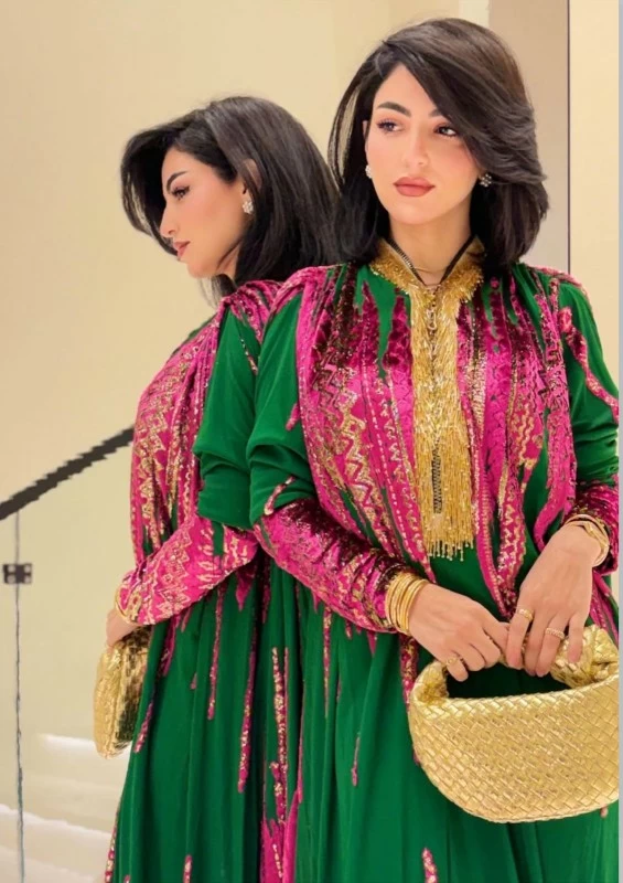 The media personality Nasra Al-Harbi shared with her followers a striking look in which she wore a jalabiya in green and pink, adorned with golden embroidery that added a luxurious touch to the design.