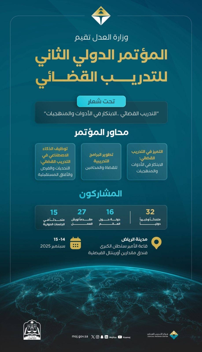 ويهدف المؤتمر، الذي يجمع نخبة من 32 متحدثاً وخبيراً دولياً من 16 دولة، إلى تبادل الخبرات واستعراض أحدث التجارب الدولية في التدريب القضائي، إضافة إلى بحث توظيف الذكاء الاصطناعي في العملية التدريبية، وتطوير برامج متخصصة للقضاة والمحامين، والاتجاهات الحديثة لقياس أثر البرامج التدريبية على المنظومة العدلية.