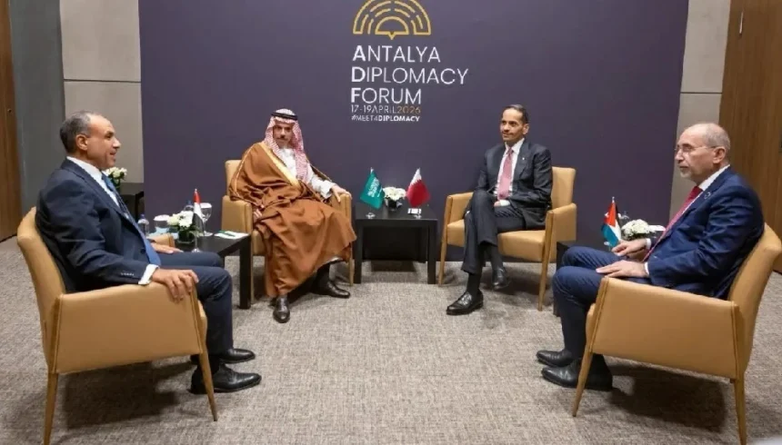 Foreign Minister Prince Faisal bin Farhan bin Abdullah participated in the consultative ministerial meeting regarding Gaza, which was held in the city of Antalya in the Republic of Turkey, alongside the Prime Minister and Minister of Foreign Affairs of Qatar, Sheikh Mohammed bin Abdulrahman bin Jassim Al Thani, the Deputy Prime Minister and Minister of Foreign Affairs and Expatriates of the Hashemite Kingdom of Jordan, Ayman Safadi, and the Minister of Foreign Affairs, International Cooperation, and Egyptians Abroad of the Arab Republic of Egypt, Dr. Badr Abdelatty, on the sidelines of the Antalya Diplomatic Forum 2026.