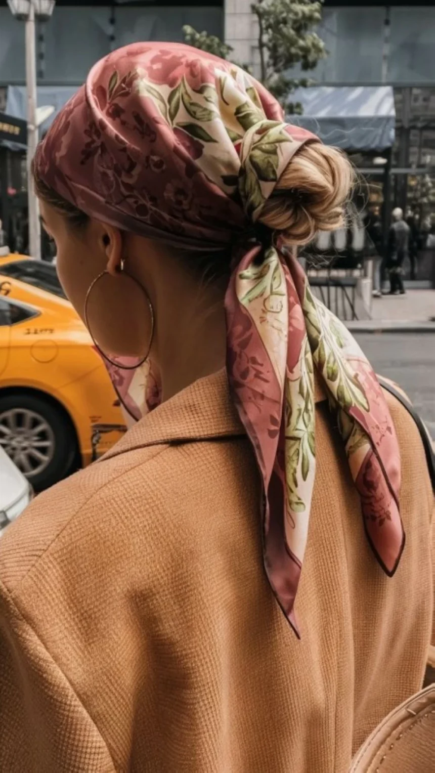 أما الطريقة الرابعة فتركز على اعتماد السكارف الحريري كربطة رأس، سواء بتثبيته خلف الرقبة أو ترك أطرافه تتدلى على الكتف. هذا الأسلوب يعكس حضوراً أنثوياً ناعماً ويجمع بين الجرأة والذوق، كما يضفي على المظهر لمحة من الإلهام الكلاسيكي الذي يعزز التميز.
