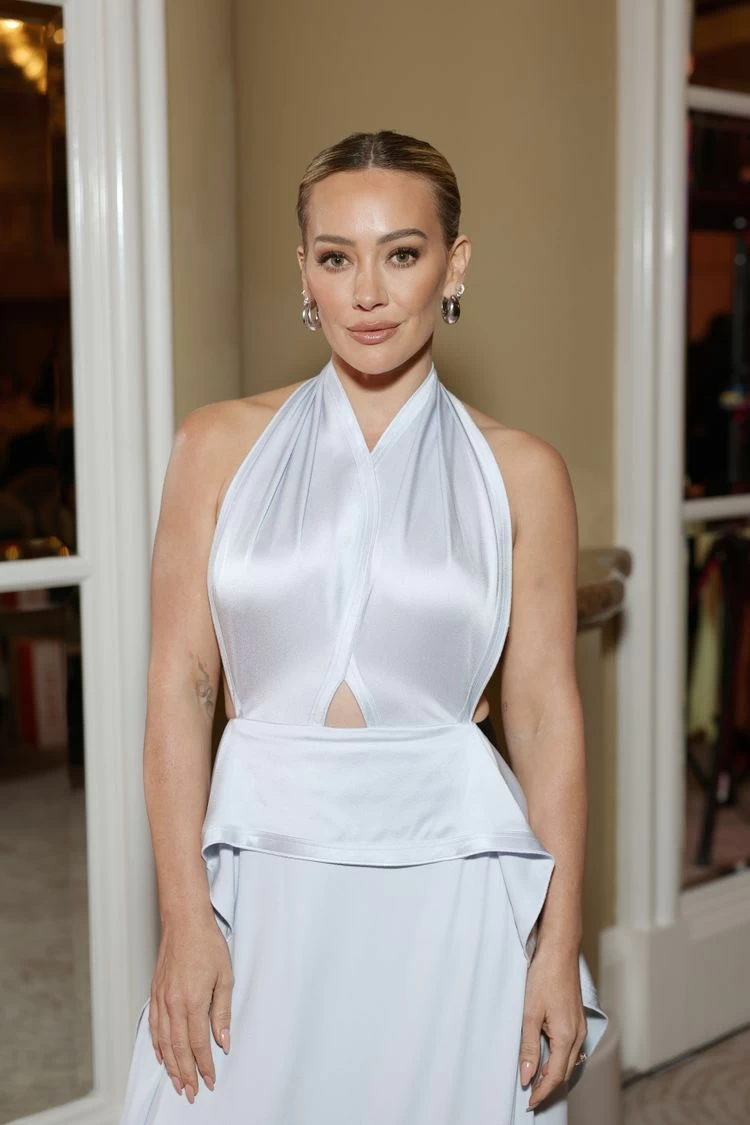لفتت Hilary Duff الأنظار بإطلالة اعتمدت على مفهوم الخداع البصري، حيث ظهرت بفستان يجمع بين البساطة والدراما في آنٍ واحد. بدا التصميم من الأمام ناعماً بلون أبيض هادئ يعكس طابعاً كلاسيكياً، فيما كشف من الخلف تفاصيل سوداء جريئة أضفت بعداً درامياً لافتاً.