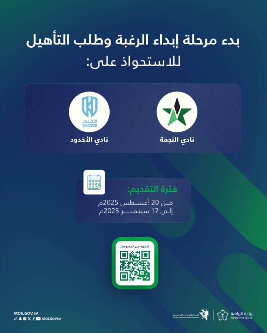 أعلنت وزارة الرياضة، بالتعاون مع المركز الوطني للتخصيص، اليوم الأربعاء 20 أغسطس 2025م، بدء مرحلة إبداء الرغبة وطلب التأهيل للاستحواذ على ناديي النجمة والأخدود، استكمالاً لخطوات العمل المتواصلة، ضمن مشروع…