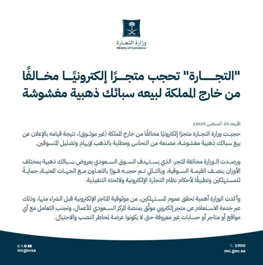 أعلنت وزارة التجارة عن حجب متجر إلكتروني مخالف يعمل من خارج المملكة، بعد رصده يروّج لبيع سبائك ذهبية مغشوشة مصنّعة من النحاس ومطلية بالذهب، بهدف خداع وتضليل المستهلكين في السوق…