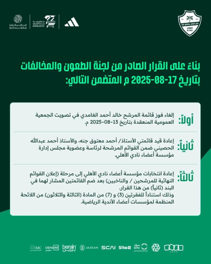 أعلن نادي الأهلي؛ بناءً على القرار الصادر من لجنة الطعون والمخالفات، إعادة انتخابات مؤسسة أعضاء نادي الأهلي غير الربحية إلى إعلان القوائم النهائية للمرشحين والناخبين.وكان قرار لجنة الطعون والمخالفات قد…