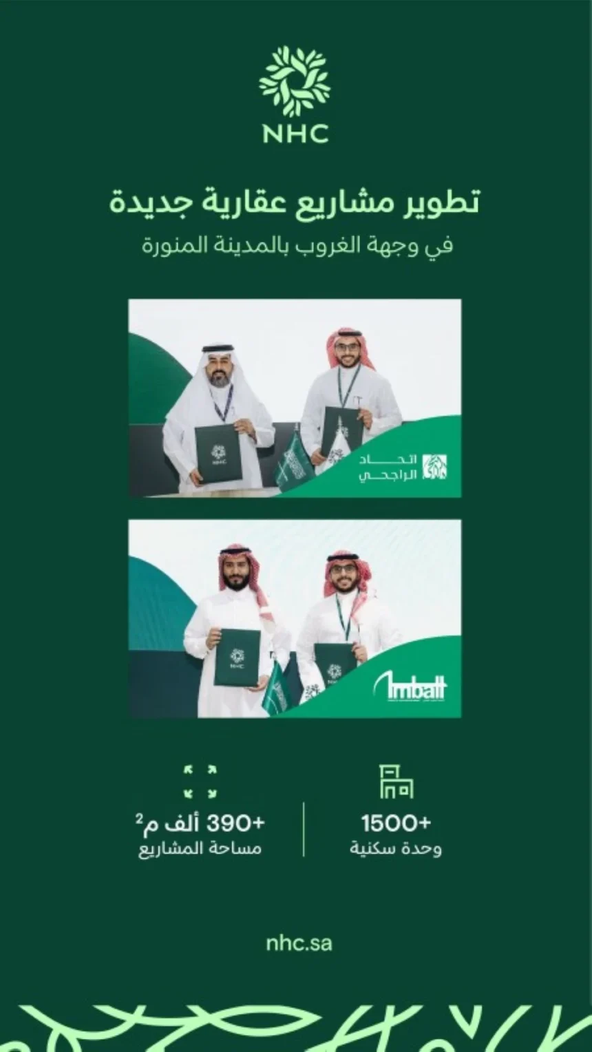 NHC has signed real estate development agreements with Al Rajhi Union Company and Al-Ambaat Real Estate to develop more than 1,500 new housing units in the Al-Ghuroob destination, as part of its efforts to provide quality housing options in one of the modern urban destinations in Medina, amidst integrated facilities and public services that offer a comprehensive lifestyle that meets aspirations.